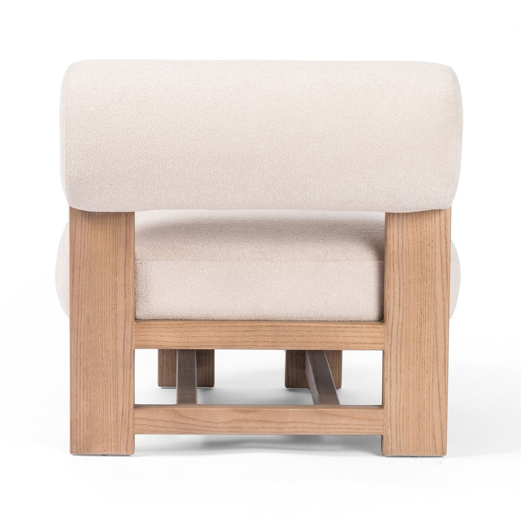 Sculptural rounded cushioning softens the linear, asymmetrical frame of this statement seating. Solid ash frame with cream-hued performance upholstery. Performance fabrics are specially created to withstand spills, stains, high traffic and wear, ensuring long-term comfort and unmatched durability.