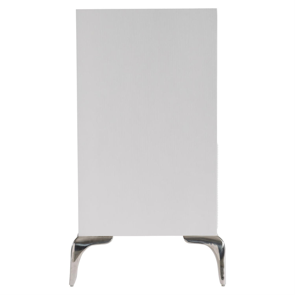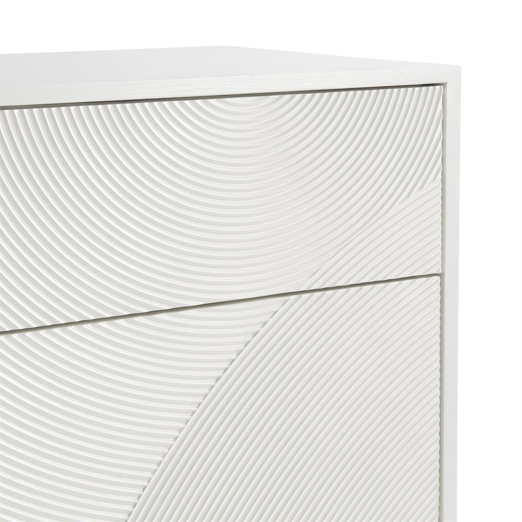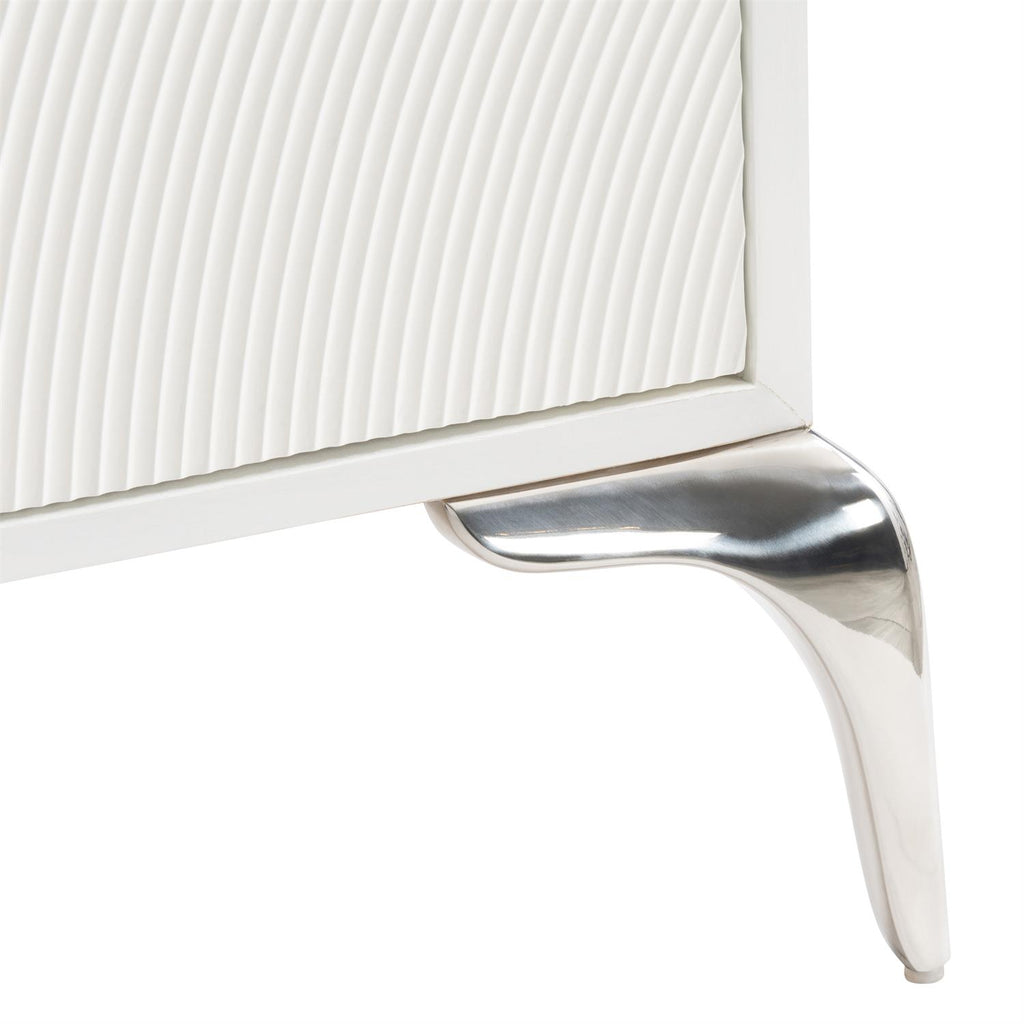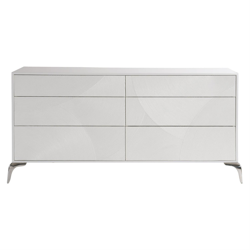Textured shapes and a glam white finish give this dresser a look all its own. Cast resin drawer fronts that are also carved with gorgeous texture give a unique look to the Montoya dresser. The six push-to-open drawers are showcased in a shimmering Frosted Pearl finish over a curved stainless steel base, creating a design that is both glam and organic. The case also includes one two-port USB charger on the back.